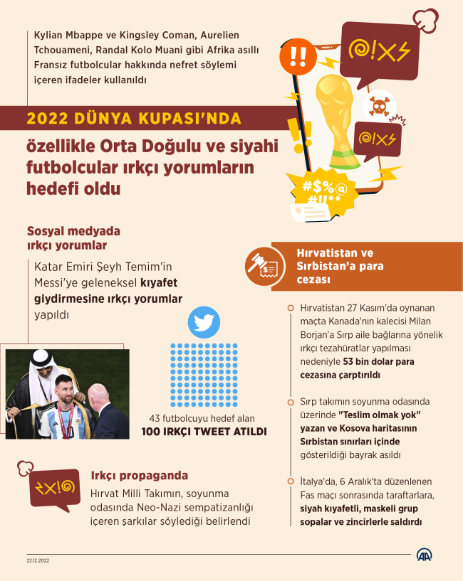 Finalde Arjantin'e penaltılarda yenilerek turnuvayı ikinci tamamlayan Fransa Milli Takım futbolcuları da ırkçı yorumların hedefi oldu. Turnuvanın gol kralı seçilen Kylian Mbappe'nin yanı sıra Kingsley Coman, Aurelien Tchouameni, Randal Kolo Muani gibi Afrika asıllı Fransız futbolcular hakkında nefret söylemi içeren ifadeler kullanıldı.