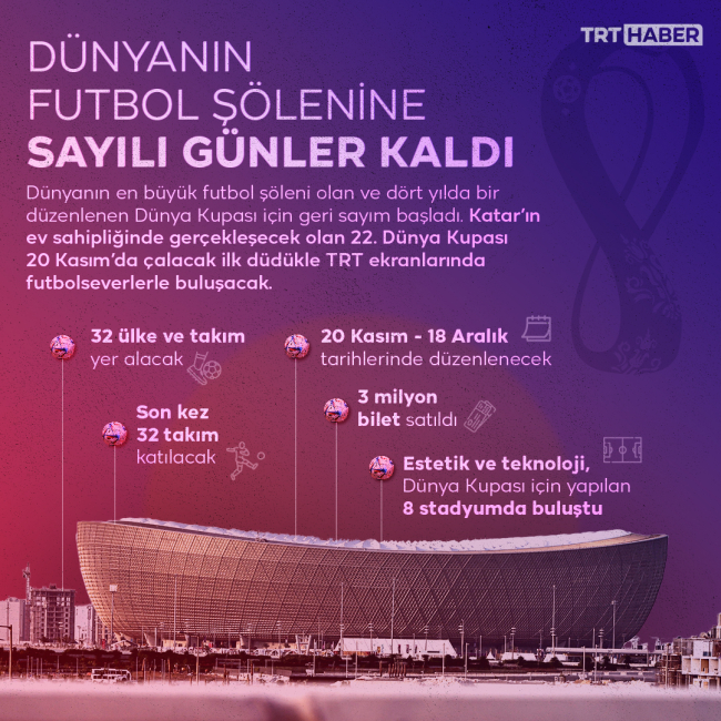 Katar'ın ev sahipliğinde gerçekleştirilen 2022 Dünya Kupası’nda 32 ülke ve takım yer alıyor. 20 Kasım-18 Aralık tarihlerinde düzenlenecek.