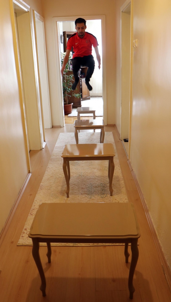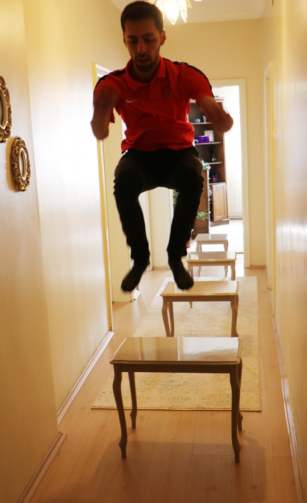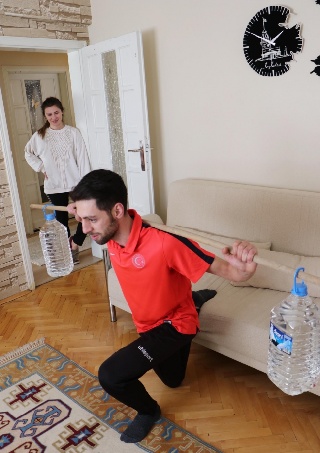Kayakla Atlama Milli Takım sporcusu Fatih Arda İpcioğlu, koronavirüs salgını nedeniyle alınan tedbirler doğrultusunda spor salonları kapatılınca evini spor salonuna çevirdi.
