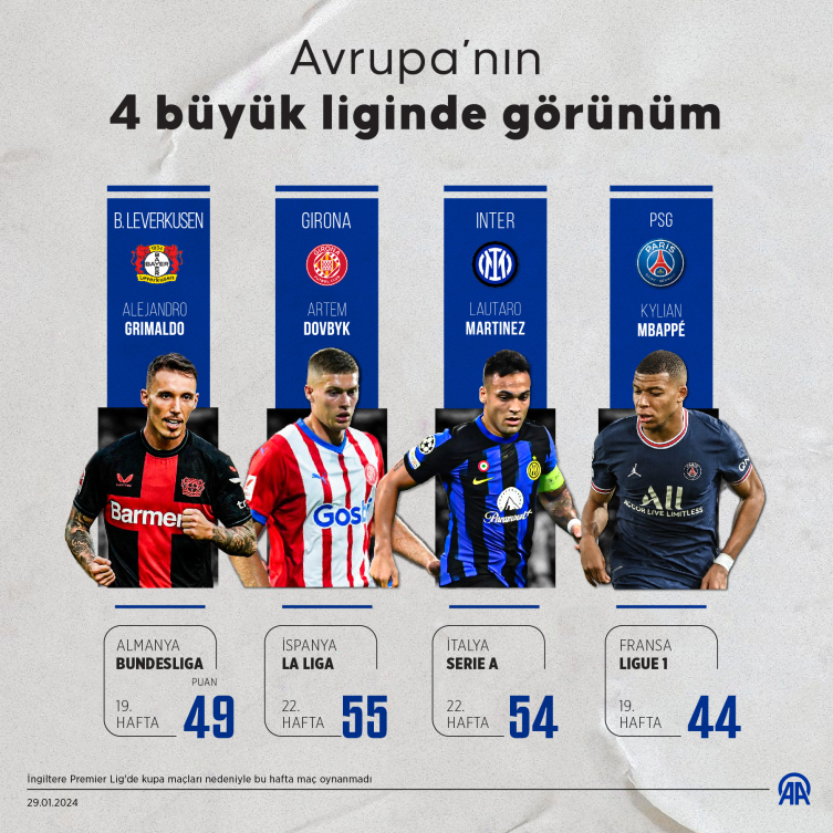 İtalya'da Inter, Almanya'da Bayer Leverkusen, İspanya'da Girona, Fransa'da ise Paris Saint-Germain (PSG), puan tablosunun zirvesinde yer aldı.