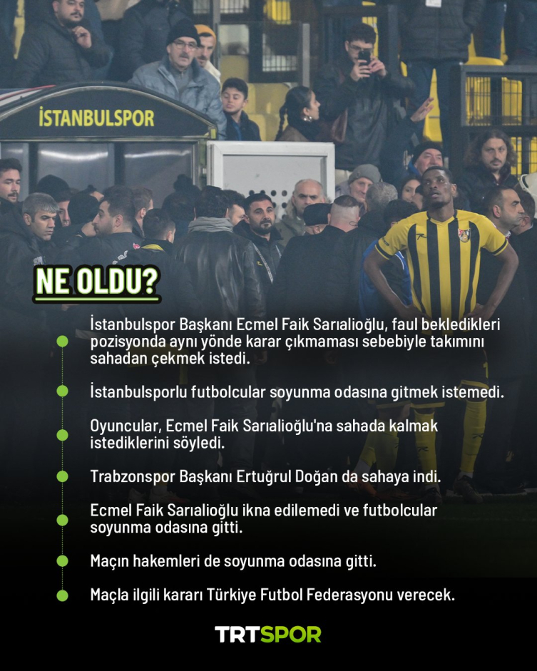 Trabzonspor Kulübü Başkanı Ertuğrul Doğan'ın da saha kenarına gelerek konuştuğu Ecmel Faik Sarıalioğlu kararından dönmedi ve İstanbulsporlu oyuncular soyunma odasına gitti.