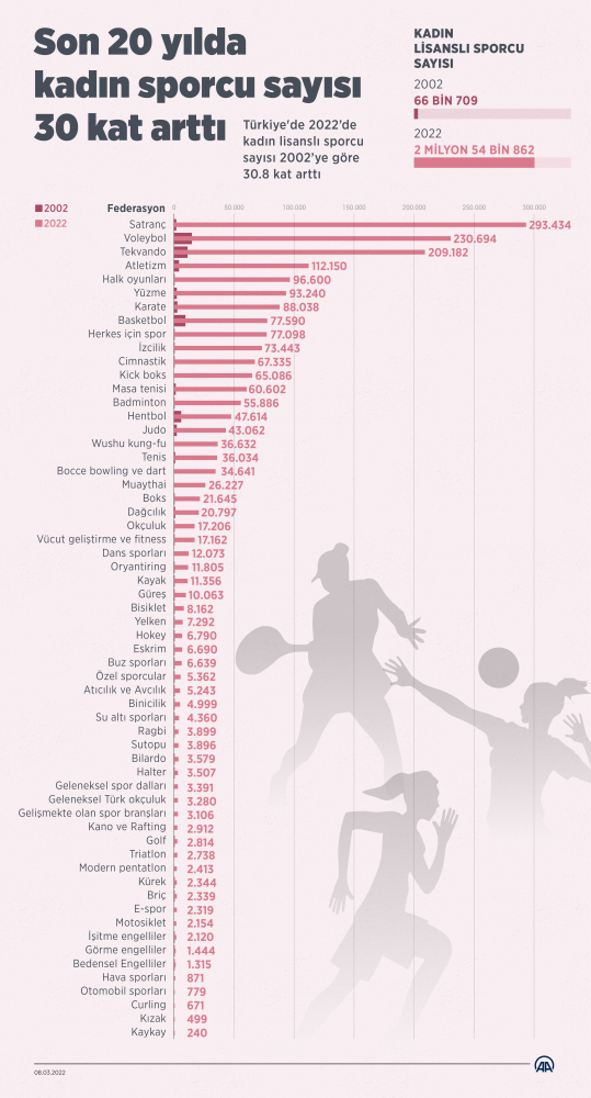 Gençlik ve Spor Bakanlığının verilerine göre, 2002 yılında 66 bin 709 olan kadın lisanslı sporcu sayısı, 2022'nin ocak ayında 2 milyon 54 bin 862'ye yükseldi.