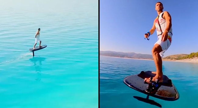 Sofuoğlu, Yeşilova ilçesinde, beyaz kumsalı ve turkuaz rengi berrak suyunun güzelliğiyle "Türkiye'nin Maldivleri" olarak ünlenen Salda Gölü'nde elektrikli sörf tahtasıyla sörf yaptığı anların görüntülerini, sosyal medya hesabından paylaştı.