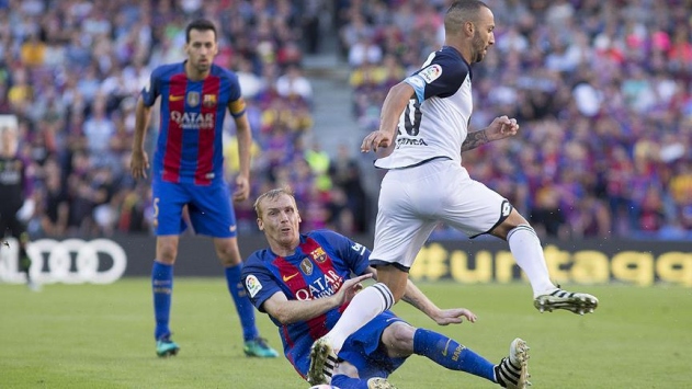 Barcelona'nın 2014'te İspanyol temsilcisi Valencia'dan kadrosuna kattığı savunma oyuncusu, La Liga'da Real Madrid'e karşı oynanacak "El Clasico" ve Osasuna ile UEFA Şampiyonlar Ligi'ndeki Borussia Mönchengladbach karşılaşmalarında takımını yalnız bırakacak.