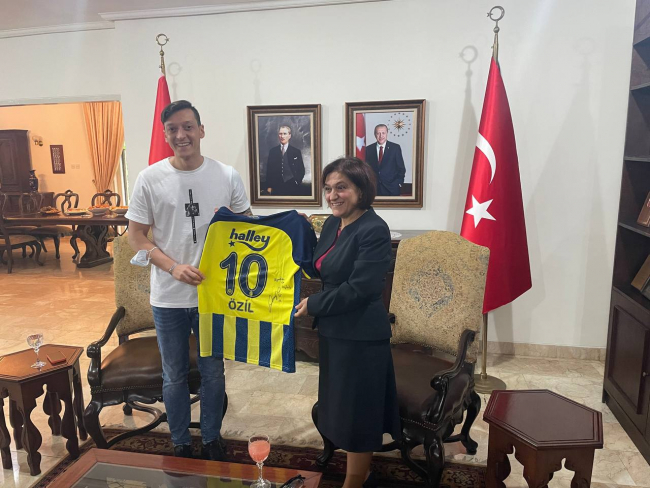 Özil de Büyükelçi Asan'a 10 numaralı Fenerbahçe formasını hediye ederek, sözleri için teşekkür etti.