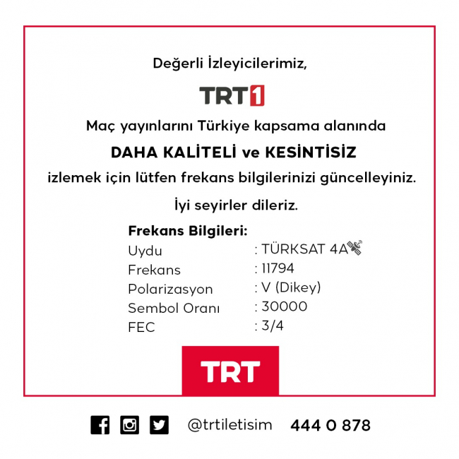 UEFA’nın şifresiz yayın haklarının Türkiye ile sınırlı olması nedeniyle izleyicilerin Portekiz-Türkiye karşılaşmasını TRT 1 ekranlarında daha kaliteli ve kesintisiz olarak izleyebilmeleri için Türkiye kapsama alanındaki frekans bilgilerini güncellemesi gerekiyor.