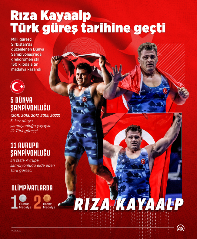Milli güreşçi Rıza Kayaalp, başkent Belgrad'da düzenlenen şampiyonanın grekoromen stil 130 kilo finalinde İranlı Amin Mirzazadeh'i geçerek beşinci kez dünya şampiyonu oldu.