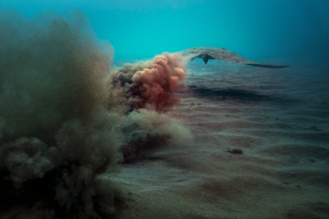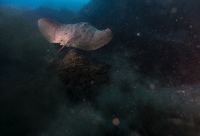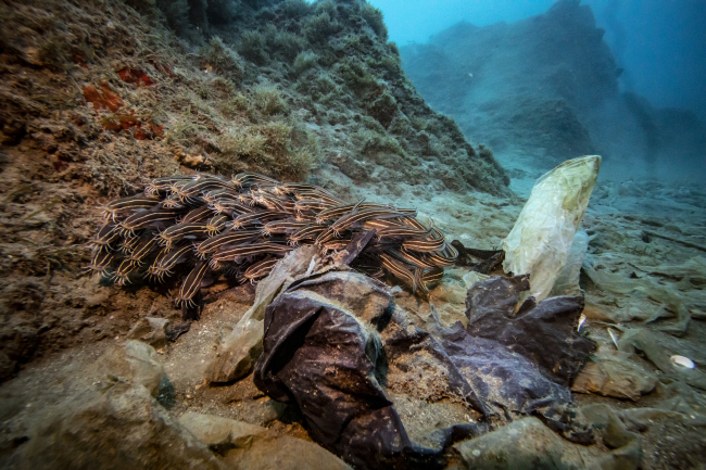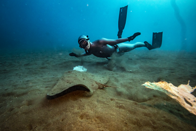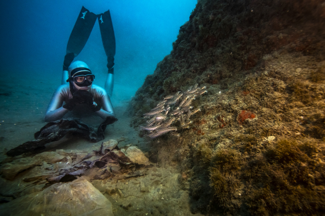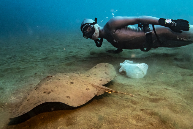 [Fotoğraf: AA]AA foto muhabiri Şebnem Coşkun, yüzlerce vatozun yaşadığı ve bu nedenle "vatoz tarlası" olarak da adlandırılan bölgede gerçekleşen dalışta Şahika Ercümen'e eşlik ederken, dalış sırasında, vatozların ve istilacı türler arasında yer alan ve son yıllarda sayısı artan kedi balıklarının, dipte, yüzlerce plastik atık arasında yaşadığı gözlemlendi.