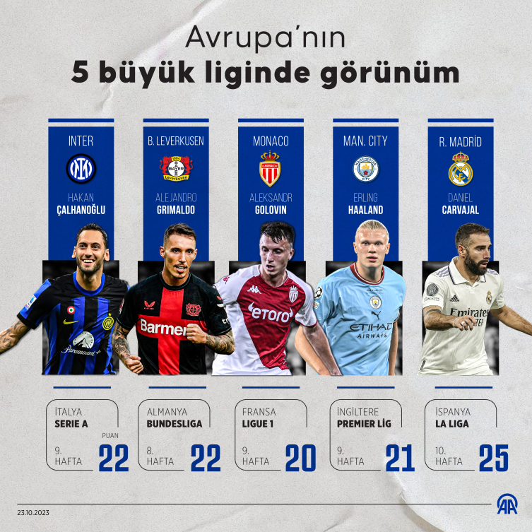 İngiltere'de Manchester City, İspanya'da Real Madrid, İtalya'da Inter, Almanya'da Bayer Leverkusen, Fransa'da ise Monaco, puan tablosunun zirvesinde yer aldı.