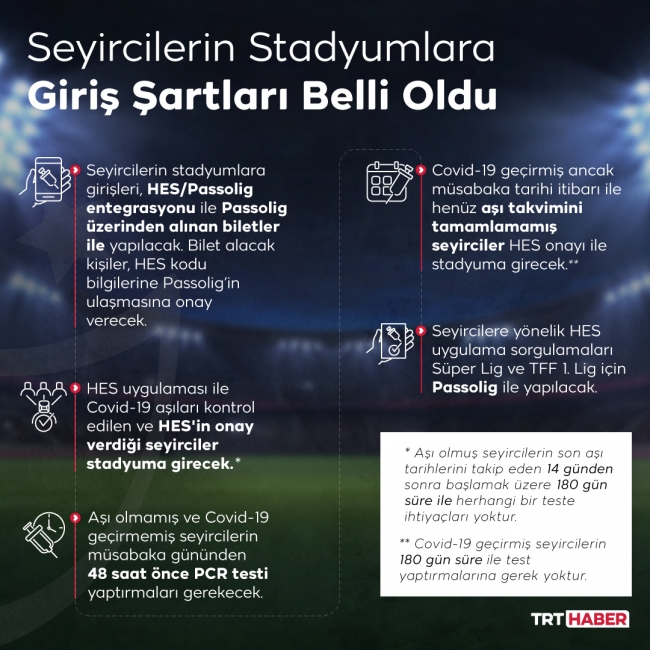 4. Covid-19 geçirmiş ancak müsabaka tarihi itibarı ile henüz aşı takvimini tamamlamamış seyirciler HES onayı ile stadyuma girebilirler.**