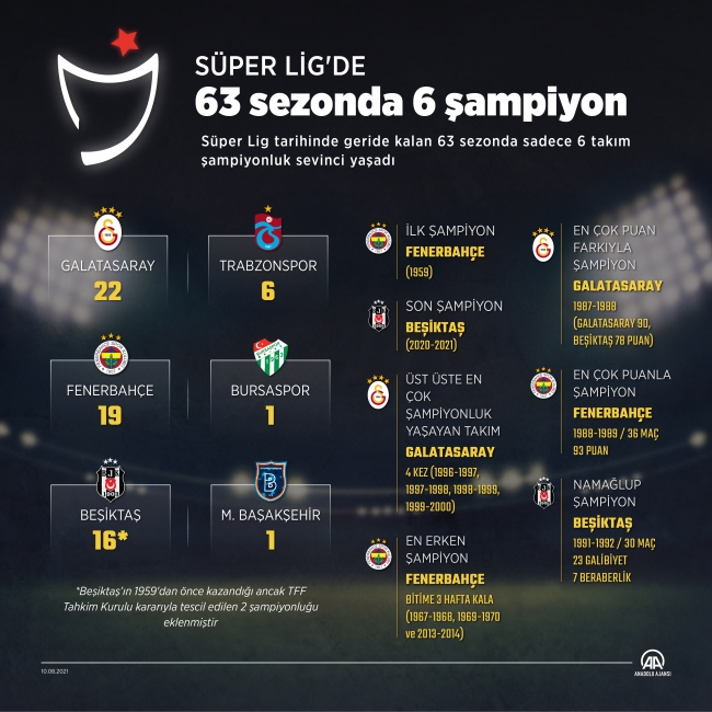 Lig tarihinde Galatasaray 22, Fenerbahçe 19, Beşiktaş 14, Trabzonspor 6, Bursaspor ve Medipol Başakşehir de birer kez şampiyon oldu.