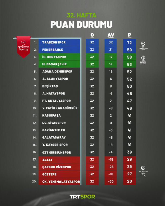 Ligde 32. hafta müsabakalarının ardından oluşan puan durumu şöyle: