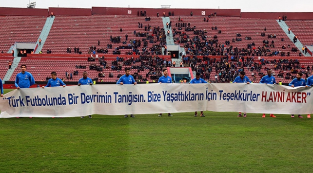Hüseyin Avni Aker Stadı'nda son maçını oynayan Trabzonspor'da futbolcular, üzerinde 'Türk futbolunda bir devrimin tanığısın. Bize yaşattıkların için teşekkürler Hüseyin Avni Aker' yazılı pankartla sahaya çıktı.
