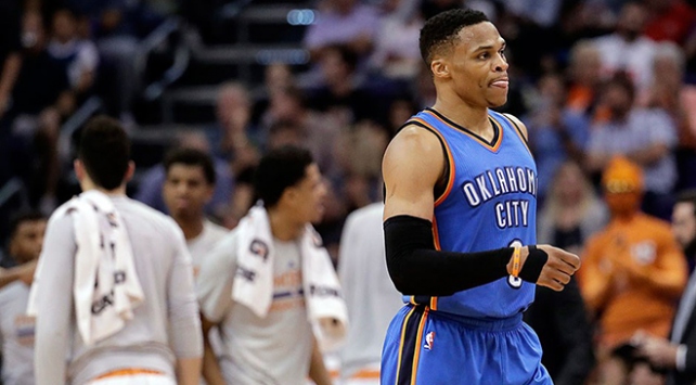 NBA'e 10 maçla devam edildi. Play-off'a kalmayı garantileyen Oklahoma City Thunder'ın yıldızı Westbrook, takımının Talking Stick Resort Arena'da konuk olduğu Phoenix Suns'a 120-99 mağlup olduğu maçtaki performansıyla tarihe geçti.