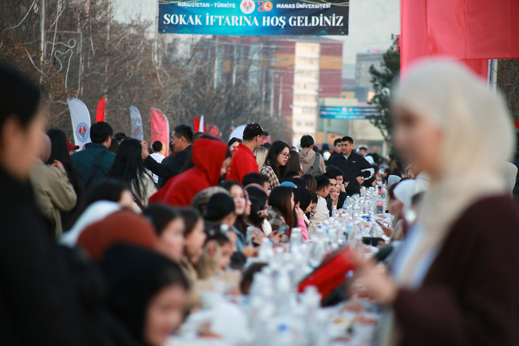 Kırgızistan-Türkiye Manas Üniversitesi (KTMÜ) Cengiz Aytmatov Kampüsü'nde fakültelerin bulunduğu Cumhuriyet Caddesi'nde çok sayıda masa kuruldu, Kırgız ve Türk bayrakları ile "Sokak iftarına hoş geldiniz" yazılı afişler asıldı.