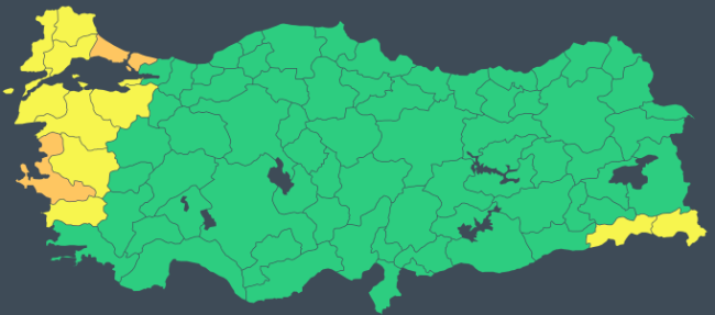 Öte yandan yarın rüzgarın fırtına şeklinde esmesi beklenen İstanbul ve İzmir için "turuncu", Aydın, Balıkesir, Bursa, Çanakkale, Edirne, Hakkari, Kırklareli, Manisa, Tekirdağ, Şırnak ve Yalova için "sarı" kodlu uyarıda bulunuldu.
