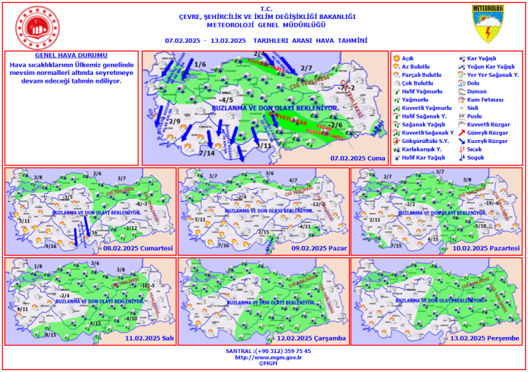 Meteoroloji Genel Müdürlüğü tarafından yapılan tahminlere göre: Ülkemiz genelinin parçalı ve çok bulutlu, Marmara’nın doğusu, İç Anadolu’nun doğusu, Batı ve Orta Karadeniz, Doğu Karadeniz kıyıları, Doğu Anadolu'nun güneybatısı, Güneydoğu Anadolu ile Kahramanmaraş, Osmaniye, Eskişehir, Çankırı, Konya, Muş ve Bitlis çevrelerinin aralıklı karla karışık yağmur ve kar yağışlı geçeceği tahmin ediliyor.