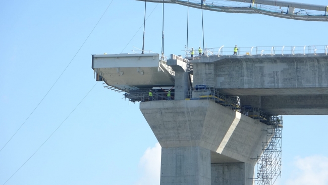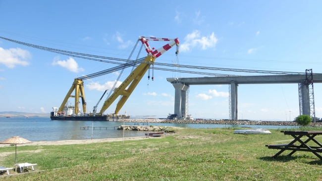 Cumhurbaşkanı Recep Tayyip Erdoğan'ın, 18 Mart 2017'de temelini attığı 1915 Çanakkale Köprüsü'nde ana halatların montajının tamamlanmasının ardından köprünün yolunu oluşturacak tabliye bloklarının montajına bugün başlandı.