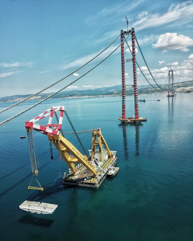 [Fotoğraf: AA]Çeliğin yanı sıra başka malzemelerin de kullanıldığı, 700 ton ağırlığındaki 153 bloktan oluşan tabliyeler, Singapur bayraklı, 106 metrelik "Asian Hercules-III" isimli yüzer vinçle yerlerine konularak sağlamlaştırılıyor.