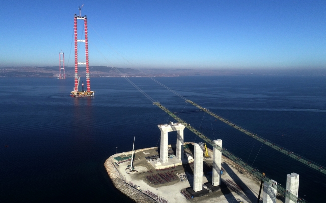 Hizmete girdiğinde dünyanın en büyük orta açıklıklı asma köprüsü unvanını alacak, renkleri, figürleri ve diğer özellikleriyle özgün mimariye sahip 1915 Çanakkale Köprüsü'nün inşası sürüyor.