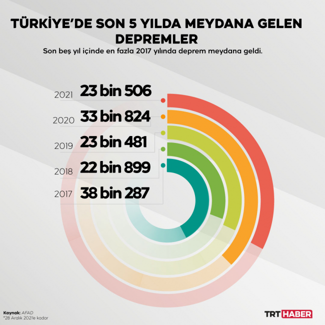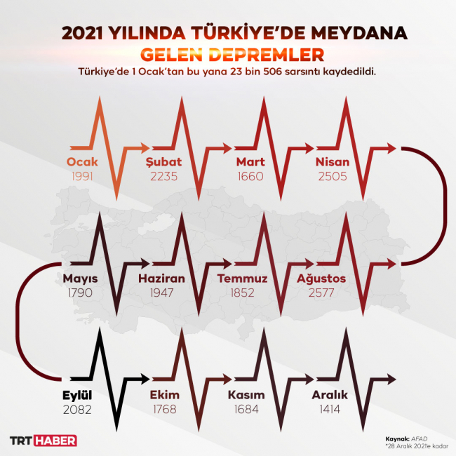2020 yılını sarsıntılarla geçiren Türkiye’de, 2021 sakin geçti. Afet ve Acil Durum Yönetimi Başkanlığının (AFAD) verilerine göre, 2021’de Türkiye’de 23 bin 499 deprem meydana geldi. Yıl boyunca yaşanan sarsıntıların bazıları panik yaratsa da yıkıcı büyüklükte bir deprem görülmedi.