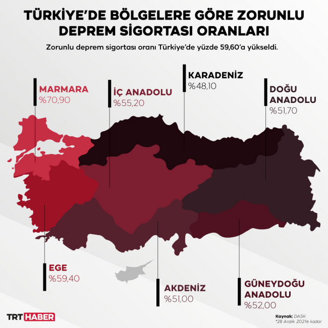 2000 yılından bu yana uygulanan Zorunlu Deprem Sigortası, Doğal Afet Kurumları (DASK) tarafından yapılıyor. 2020’de zorunlu deprem sigortası oranı yüzde 56, sigortalı konut sayısı 9,9 milyondu. 2021’de ise sigortalılık oranı yüzde 59,60’a yükseldi.