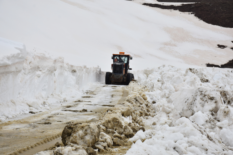 Zorlu arazi şartlarında kar kalınlığının yer yer 2 metreyi bulduğu yolu açmak için mesai yapan ekipler, bazı noktalarda kar tabakasının sertleşmesi nedeniyle güçlükle ilerleyebiliyor.