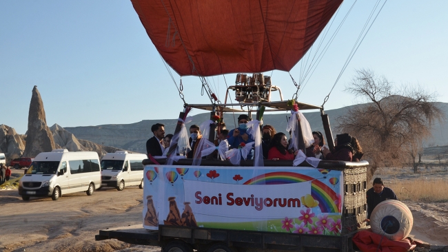 Dünyaevine girmeye hazırlanan Gülten Kara ve İbrahim Korkmaz çifti, sıcak hava balonuyla sabah erken saatlerde Kapadokya semalarına yükseldi.