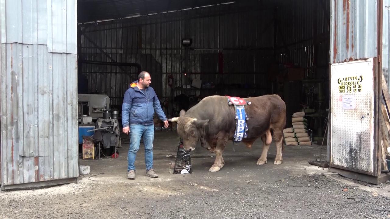 Artvin Sanayi Sitesi ustalarından Köksal Avcı'nın en büyük neşesi, yanından 8 yıldır ayırmadığı boğası.