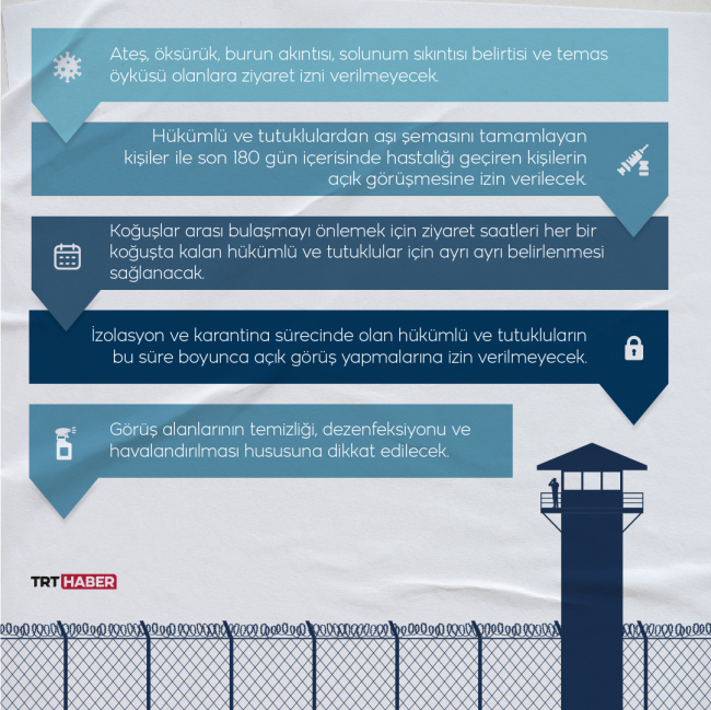 - Hükümlü ve tutuklulardan Sağlık Bakanlığı COVİD-19 Temaslı Takibi ve Evde Hasta İzlemi ve Filyasyon Rehberi'nde belirtilen önerilen aşı şemasını tamamlayan kişiler ile son 180 gün içerisinde hastalığı geçiren kişilerin açık görüşmesine izin verilecek.