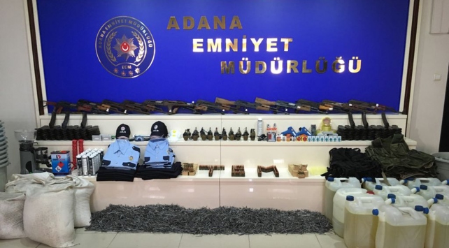 Güvenlik kaynaklarından alınan bilgiye göre, MİT ve Adana Emniyet Müdürlüğü ekiplerinin ortak çalışmasıyla merkez Çukurova ilçesinde bir villada ele geçirilen 12 kalaşnikof marka tüfek, 24 el bombası,12 polis üniforması, 1,5 ton amonyum nitrat, 300 kilogram çivi, 12 hücum yeleği, 96 şarjör, bine yakın mermi, bomba yapımında kullanılacak kablo ve benzeri malzemeler ile 240 litre benzin ve yaşamsal malzemelerin detaylı incelemesi yapılıyor.