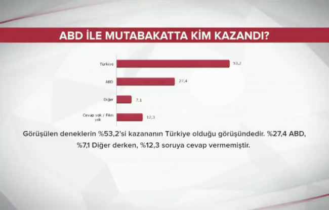 "Kim kazançlı çıktı diye sorduk. Kamuoyunun büyük bir bölümü ABD ile yapılan anlaşmadan Türkiye'nin kazançlı çıktığını düşünüyorlar. ABD daha karlı çıktı diyenlerin her dört kişiden biri olduğunu görüyoruz. Bu soruya cevap veremeyenler de var o tarihde anlaşma yeni yapılmıştı konuya tam olarak vakıf değildi.
