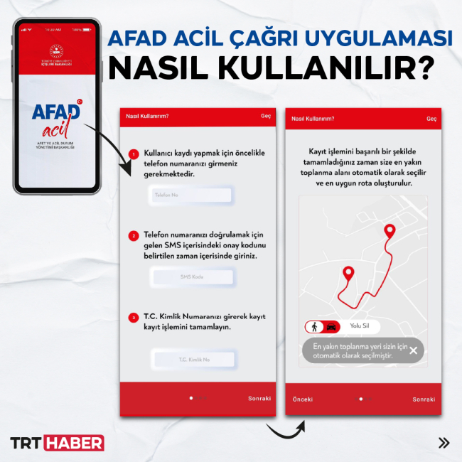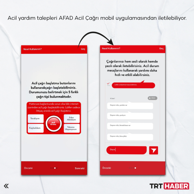 [Grafik: TRT Haber]AFAD Acil mobil uygulamasının Tek Tuşla Acil Çağrı fonksiyonu, GSM hatlarındaki yoğunluğun önüne geçerek, acil çağrı görüşmesinin internet üzerinden yapılabilmesine, konum servisleri ile arayan kişinin bulunduğu noktanın tespit edilmesine olanak sağlıyor.
