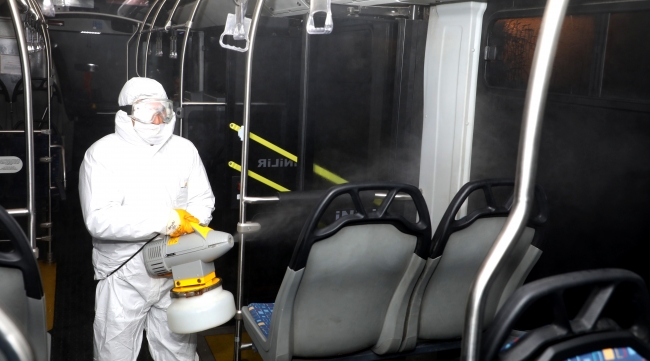[Ekipler, koronavirüse karşı otobüste dezenfekte işlemi yaptı - Fotoğraf: AA]İlaçlama çalışmalarının periyodik olarak devam edeceğini belirten Veteriner İşleri Müdürü İsmail Atlı, şunları kaydetti:
