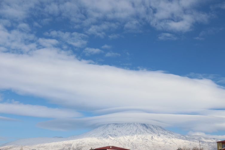 Dağın üst kısımlarını ve zirvesini, halk arasında "şapka" diye bilinen mercek bulutu sardı.