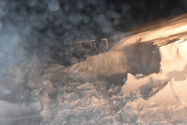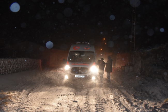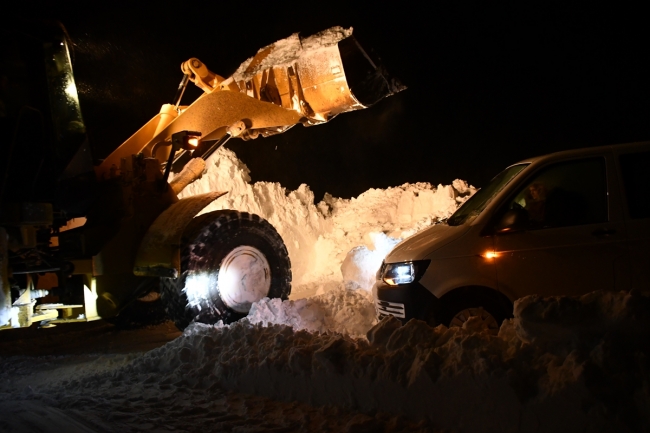 Tipi nedeniyle bölgeye zorlukla ulaşan ekipler, kar kalınlığının 1 metreyi aştığı köy yolunda kara saplanan minibüsün önünü iş makinesiyle açtı.