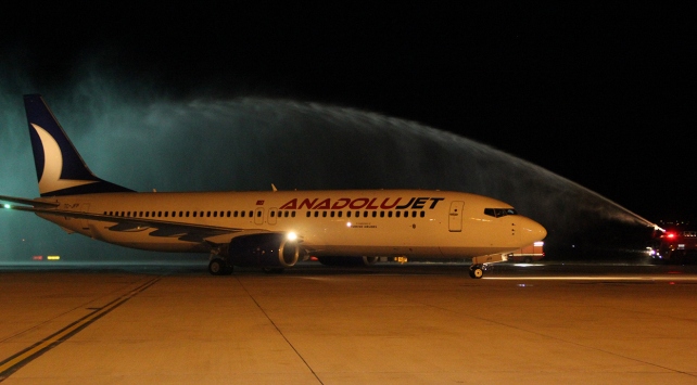 Sabiha Gökçen Havalimanı'ndan 160 yolcuyla hareket eden AnadoluJet uçağı, Erzincan'daki havalimanında itfaiye ekiplerince oluşturulan su köprüsünün altından geçerek aprona yanaştı.