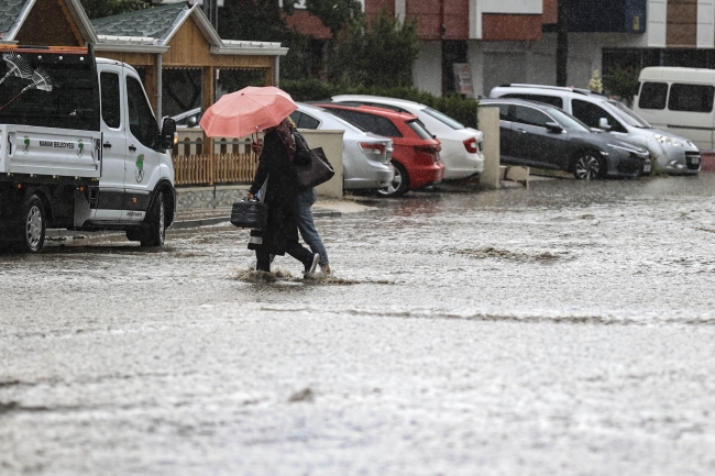 [Fotoğraf: AA]Zaman zaman doluyla karışık yağan yağmur, bazı caddeleri suyla doldurdu.