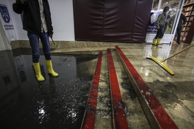 Sağanak nedeniyle Sıhhiye'de bulunan Zafer Çarşısı'nı su bastı. Çarşıdaki dükkan sahibi ve belediye çalışanları, içeride biriken suyu temizledi.
