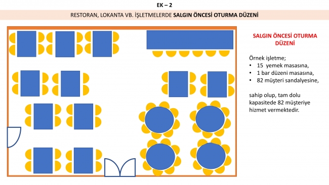 "COVID-19 Salgın Yönetimi ve Çalışma Rehberi"ndeki mesafe kuralları ile belirtilen kapasite kullanım oranlarına göre her bir yeme-içme yeri için oturma düzeni planı hazırlanacak, içeride aynı anda bulunacak müşteri sayısı, müşterilerin içeriden ve dışarıdan rahatlıkla görebileceği şekilde ilan edilecek.