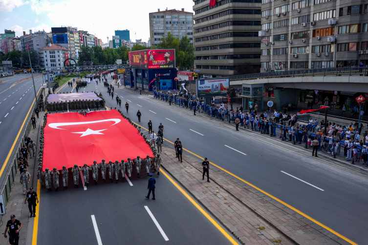 Zafer Bayramı kutlama programları kapsamında düzenlenen yürüyüş öncesi, TBMM İsmet İnönü Bulvarı girişinde yerini alan Türk Silahlı Kuvvetleri (TSK) bünyesindeki karma bando ekibince çeşitli marşlar seslendirildi.