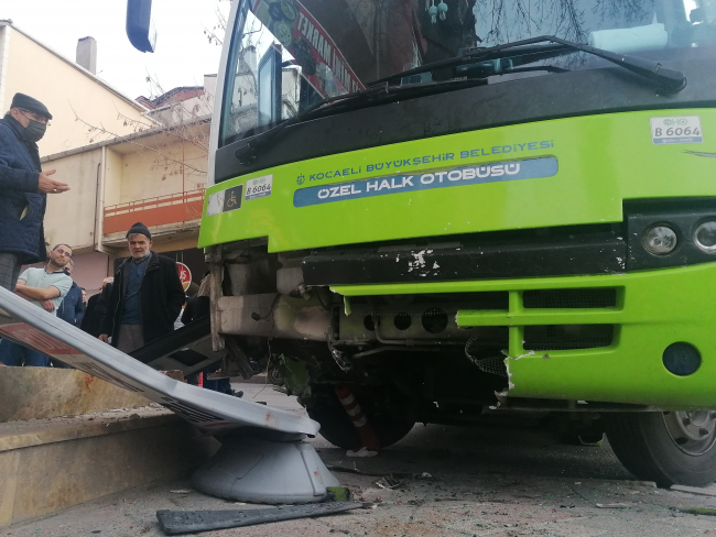 Çarpışmanın etkisiyle hafif ticari araç yolun karşı şeridine savrulurken, otobüs ise önce durağa, sonra bir marketin camına çarparak durabildi.