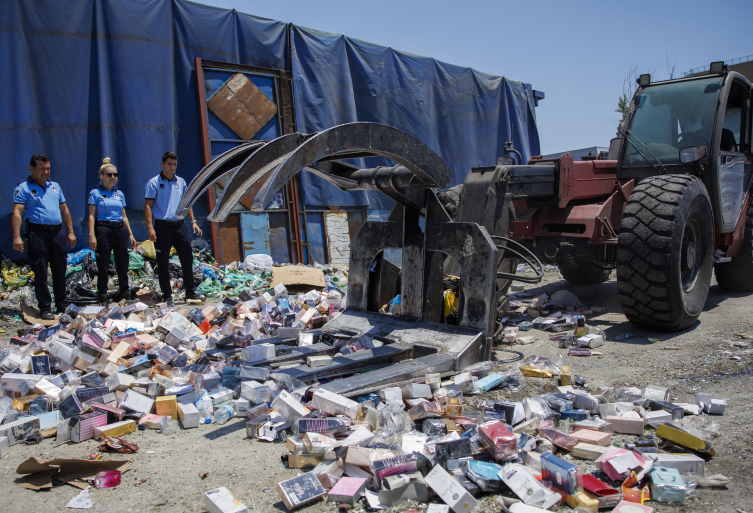 [Fotoğraf: AA]El konulan sahte parfümler, dozerle ezilerek imha edildi.