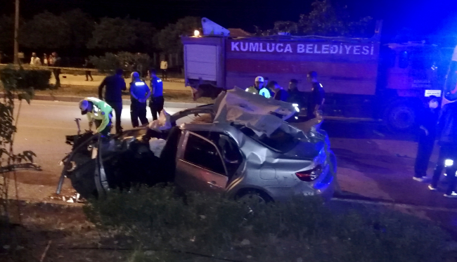 Kumluca Belediyesine ait Y.A'nın kullandığı su tankerine, Ahmet Aliağa Bulvarı'nda refüjde sulama yaptığı sırada 23 yaşındaki Veli Dalkıran'nın kullandığı otomobil çarptı.