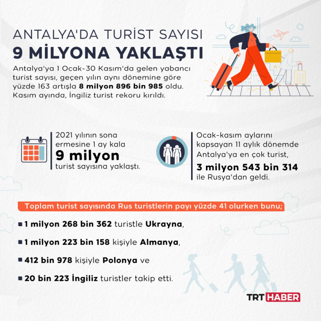Antalya Valiliğinden yapılan açıklamada, Kültür ve Turizm İl Müdürlüğü verilerine göre, 2021 yılının sona ermesine 1 ay kala 9 milyon turist sayısına yaklaşıldığı aktarıldı.