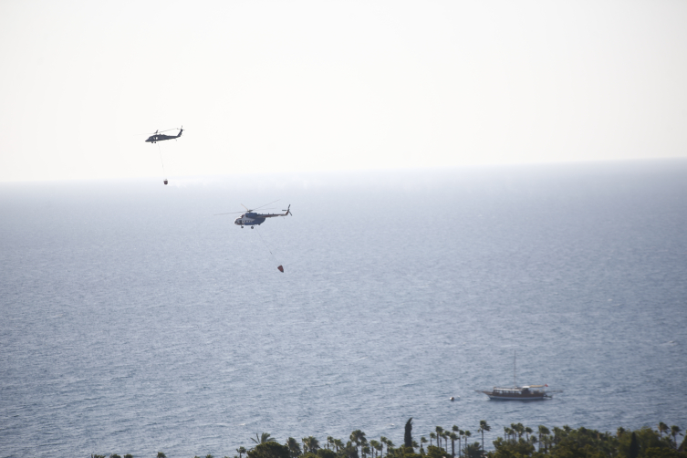 Gece boyunca arazöz ve iş makineleriyle karadan yürütülen çalışmalara, sabahın ilk ışıklarıyla hava araçları da katıldı. Ekipler, 11 uçak, 22 helikopterle denize alçalarak su aldıktan sonra alevlerin üzerine boşaltıyor. Yoğun hava trafiğinin yaşandığı bölgede aynı anda 4-5 hava aracı denizden su alarak, yangının sürdüğü ormanın üzerine döküyor.