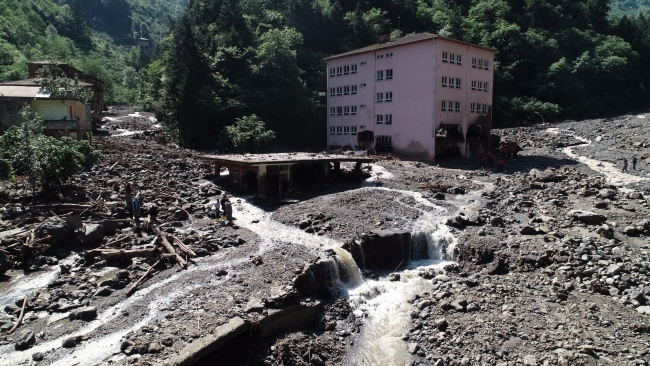 "Araklı Belediyesi ekipleri burada çalışıyorlardı. Tam da öğle molası verdikleri vakitti. Hemen şu karşıda bir köy bakkalı diyebileceğimiz bir yerde yemek yiyerek, istirahat ederken bu sel onları burada yakaladı. 4 kullanılan, 3 yarı kullanılan içinde kimsenin olmadığı bina toplam 7 bina selle birlikte yerinden söküldü, ancak temelleri kaldı. Arkadaşlar tarafından aramalar hala devam ediliyor. Jandarma ve arama kurtarma ekipleri bu hattı boylu boyunca arıyor."
