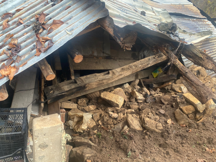 Heyelanda, kimsenin bulunmadığı 2 katlı ahşap ev ile yanındaki ahır yıkıldı.