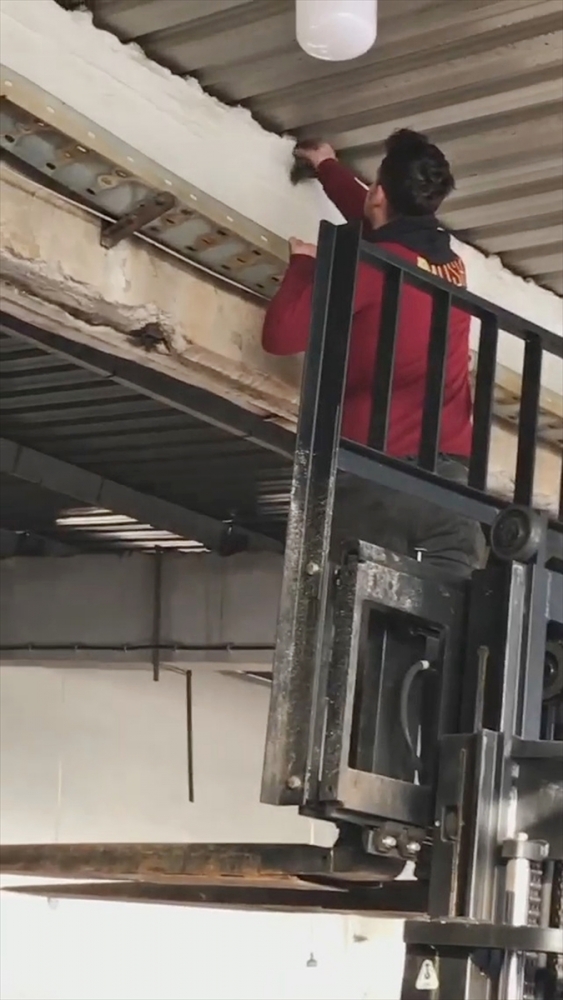 Yük kaldırma aracı yardımı ile tavana ulaşan işçiler, yaralı kuşu bulunduğu yerden kurtararak veterinere götürdü.