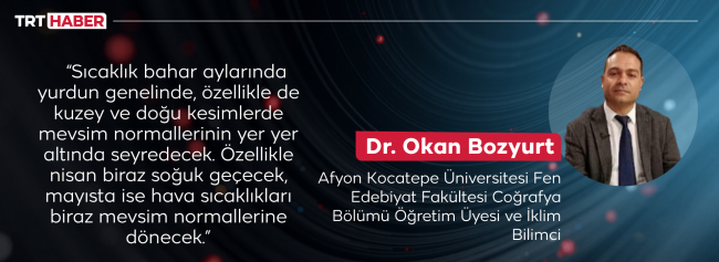 “Sıcaklık bahar aylarında yurdun genelinde, özellikle de kuzey ve doğu kesimlerde mevsim normallerinin yer yer altında seyredecek. Özellikle nisan biraz soğuk geçecek, mayısta ise hava sıcaklıkları biraz mevsim normallerine dönecek.”